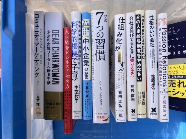 起業、自己啓発、経営、マネジメント、マーケティングなどのビジネス書、人事採用などの実務書、SF小説など、段ボール3箱分の古書をお譲りいただきました。
